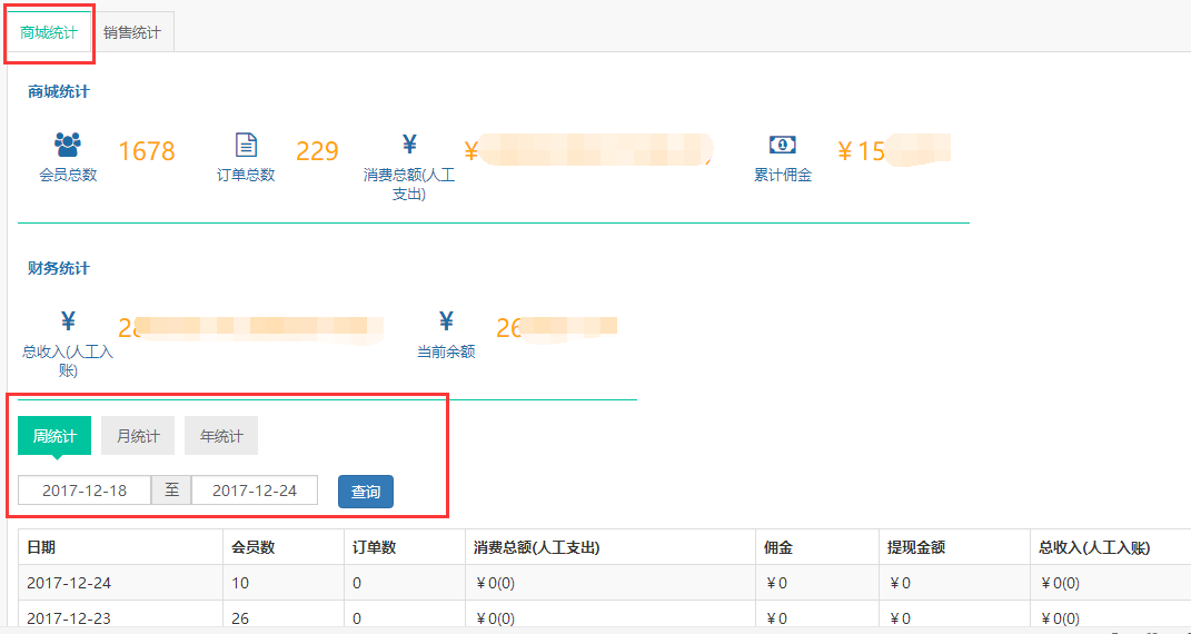 可查询每周、每月、每年的会员数、订单数、消费总额、佣金、提现金额、总收入