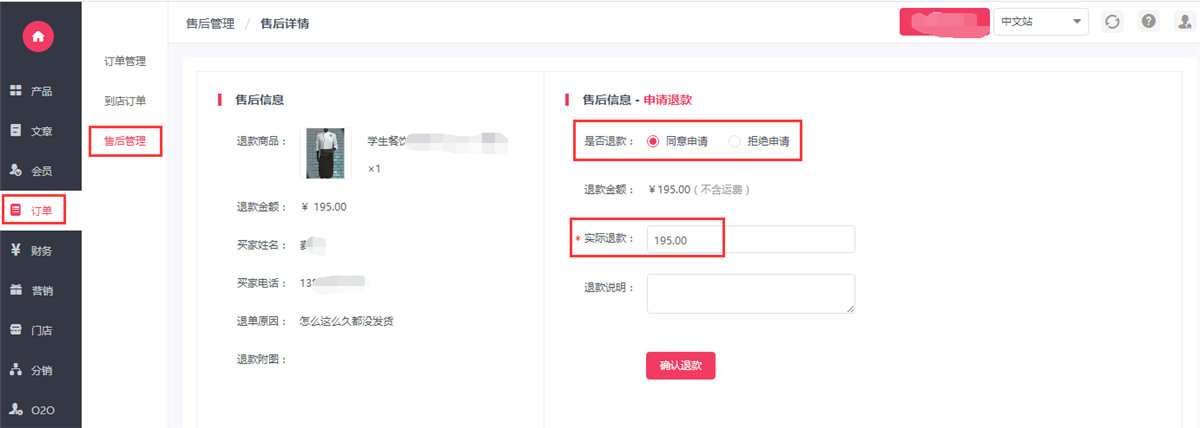 2、点击“去审核”可以操作是否同意退款、退款金额、退款说明。同意退款后,金额是退到客户会员中心余额的,客户可以把余额提现,若拒绝退款,客户也可以在自己会员中心订单详情里查看拒绝原因。
