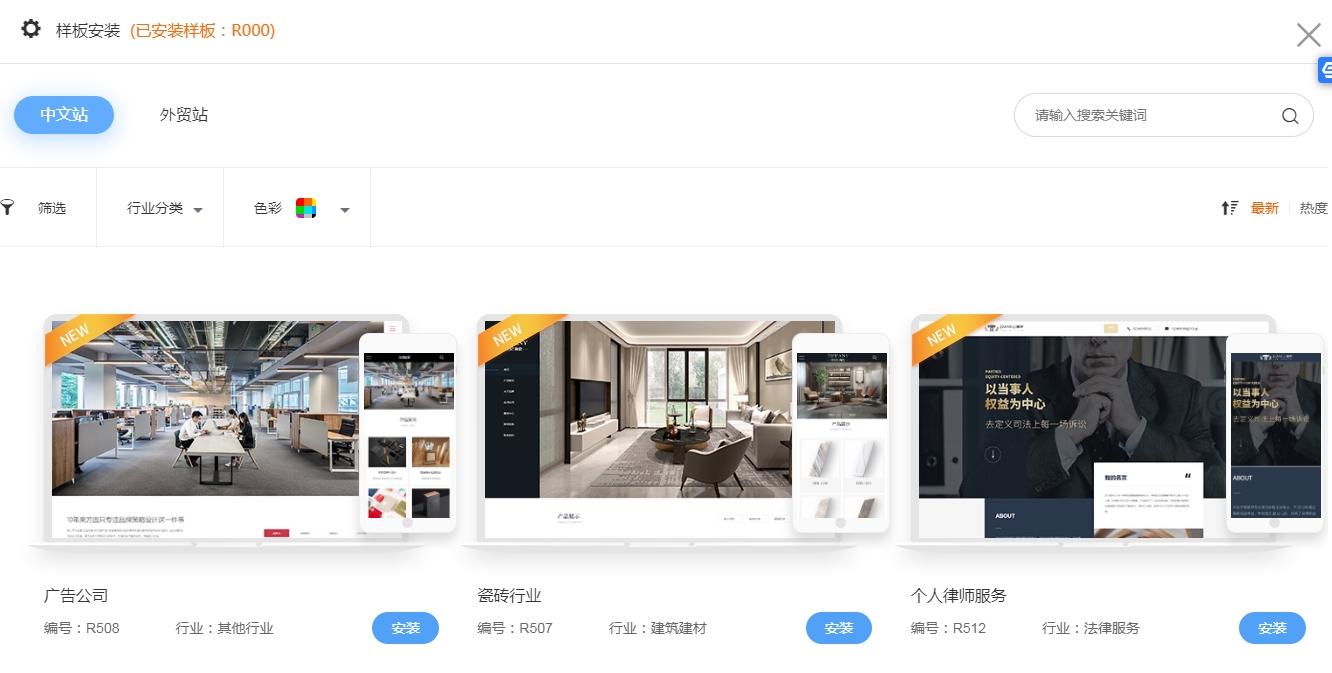 进入网站后台编辑后,我们先选择一个风格内容相近的模板,可以筛选行业、色彩,然后安装模板,等待几分钟模板安装完。